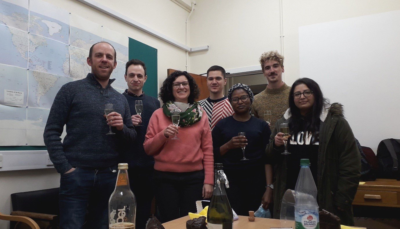 Raising the glasses post-viva, from left to right: Prysor, Richard, Isabel, Djordje, Aisha, Nathan and Annum.