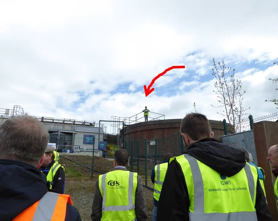 Photo 2: Isabel standing on the Blackstairs water tank while taking the group picture in Photo 3.