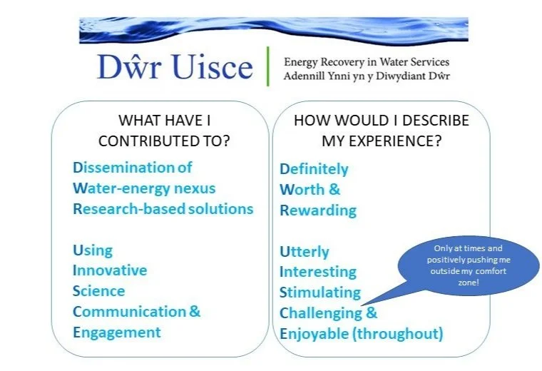 None of this could have happened without the interest and participation of non-academic partners, without the collaboration with other team members, without the support and encouragement of Professors Paul Coughlan and Aonghus McNabola, and last but not least, the funding from the Ireland-Wales programme. So, in summary, below is my experience on the Dŵr Uisce project!
