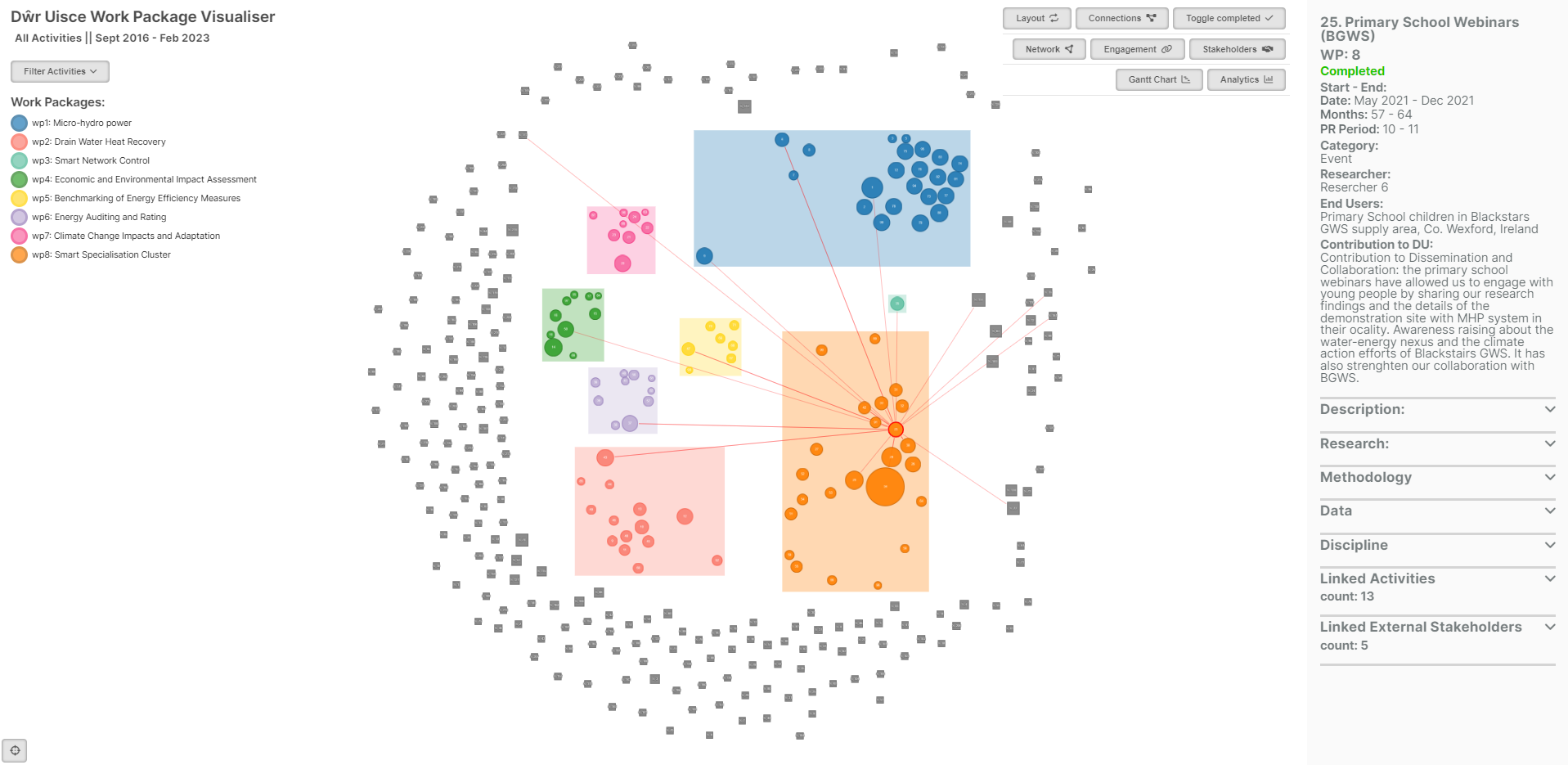 I have been working closely with WP8 (Smart Specialisation Cluster) over the last 10 months developing the Dŵr Uisce Visualization tool (DUVis) to map interdisciplinary and transdisciplinary collaboration over the projects lifespan. I am thrilled to be a part of the Dŵr Uisce team, it has been a great chance to work with different domain experts and has been a real eye opener to the value of working across disciplines.